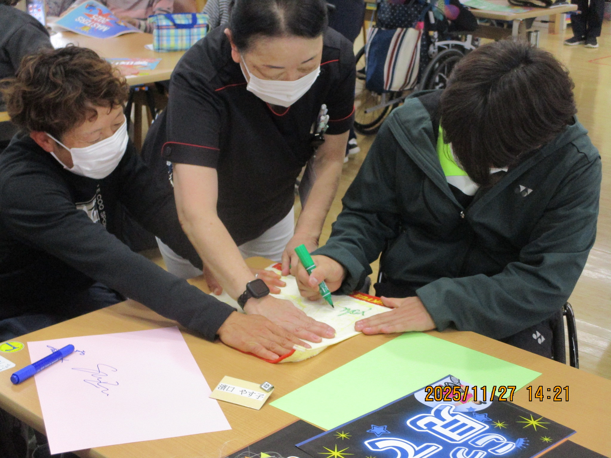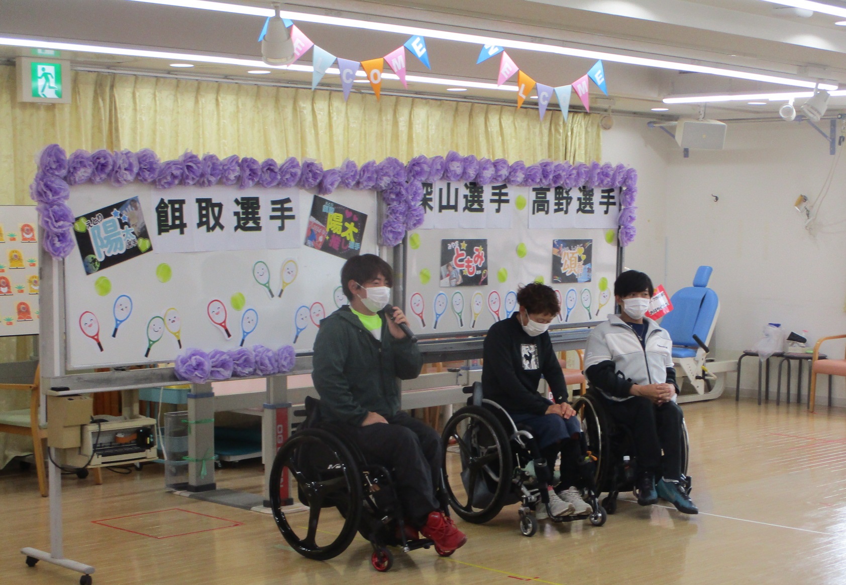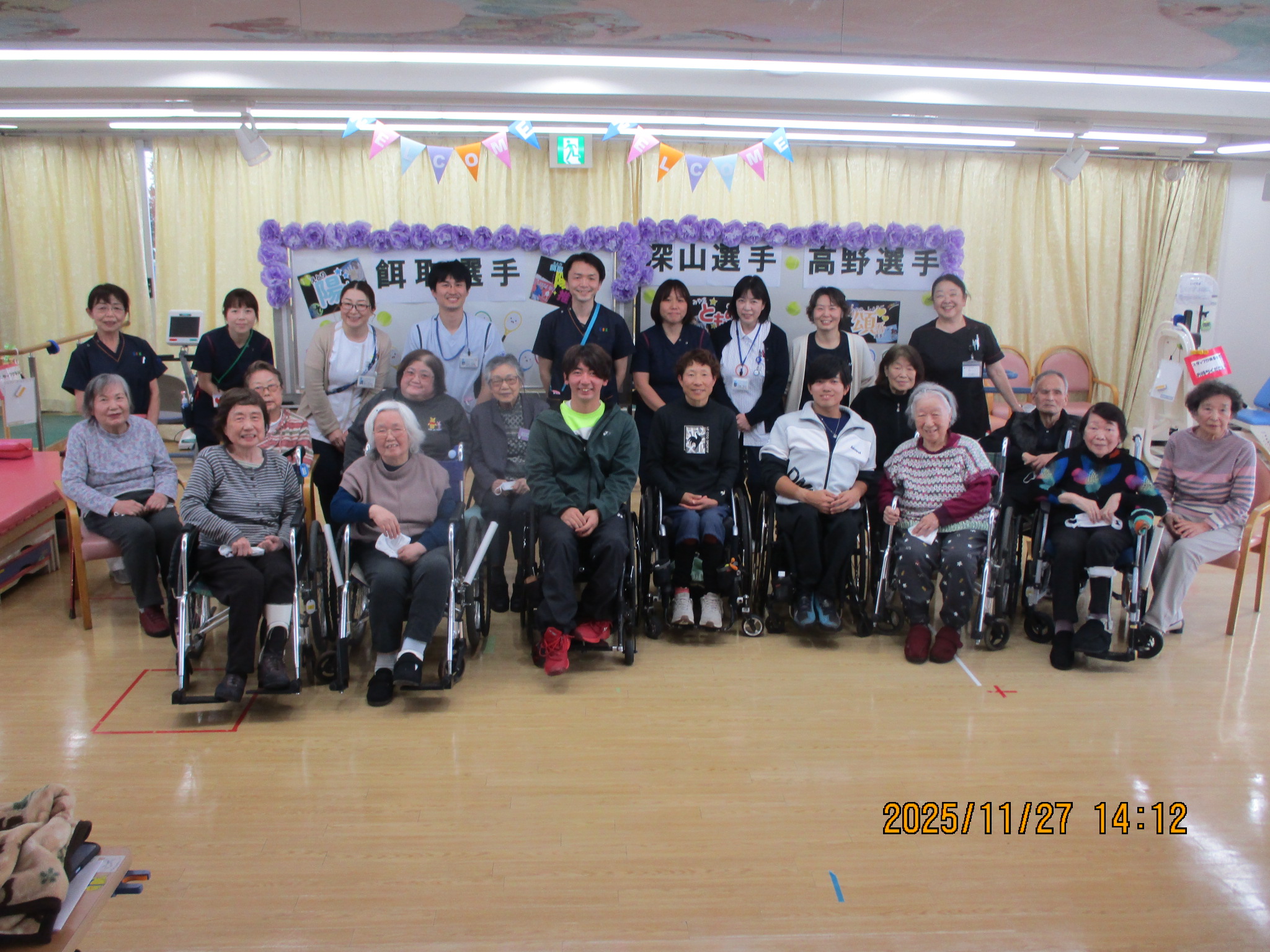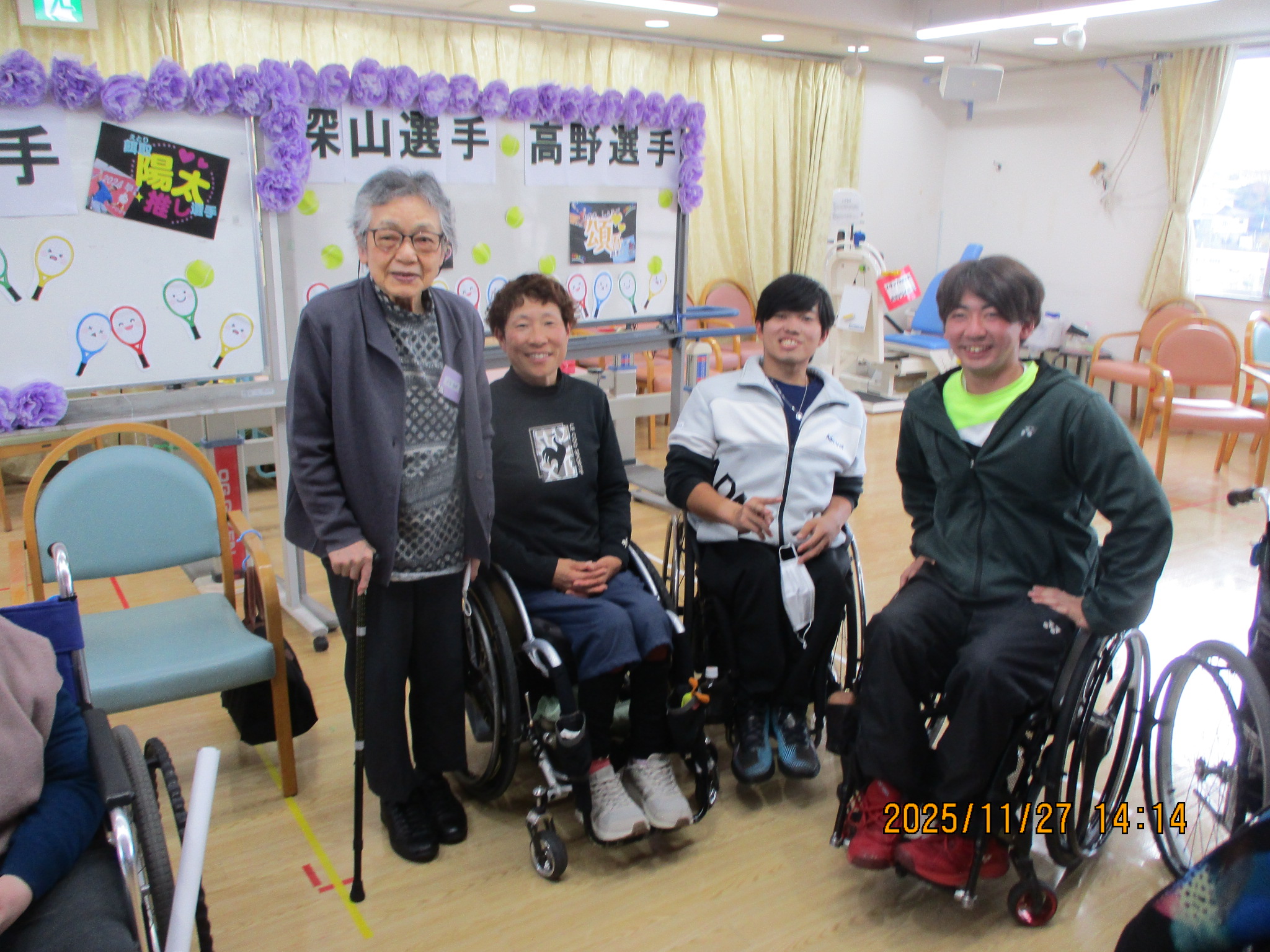 11月吉日、吉田記念テニス研修センター(TTC)から、深山 知美選手、高野 頌吾選手、餌取 陽太選手が普段からリハビリを頑張っている利用者様を激励に訪問して下さいました。