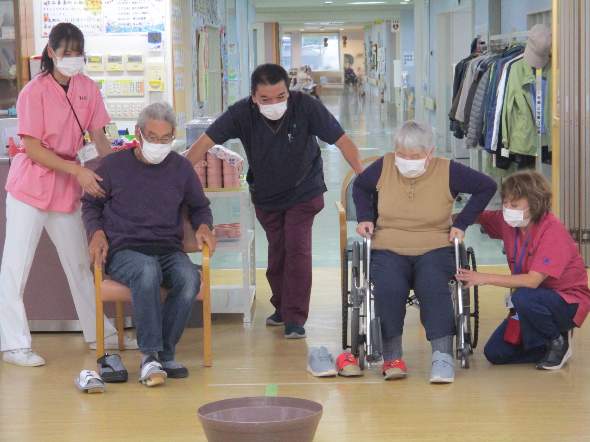 デイケアでは、毎日のレクリエーションの一環として「運動会週間」と称し、風船バレー、借り物競争、スリッパ飛ばし、玉入れなど誰でも参加できる種目を日替わりで行いました。