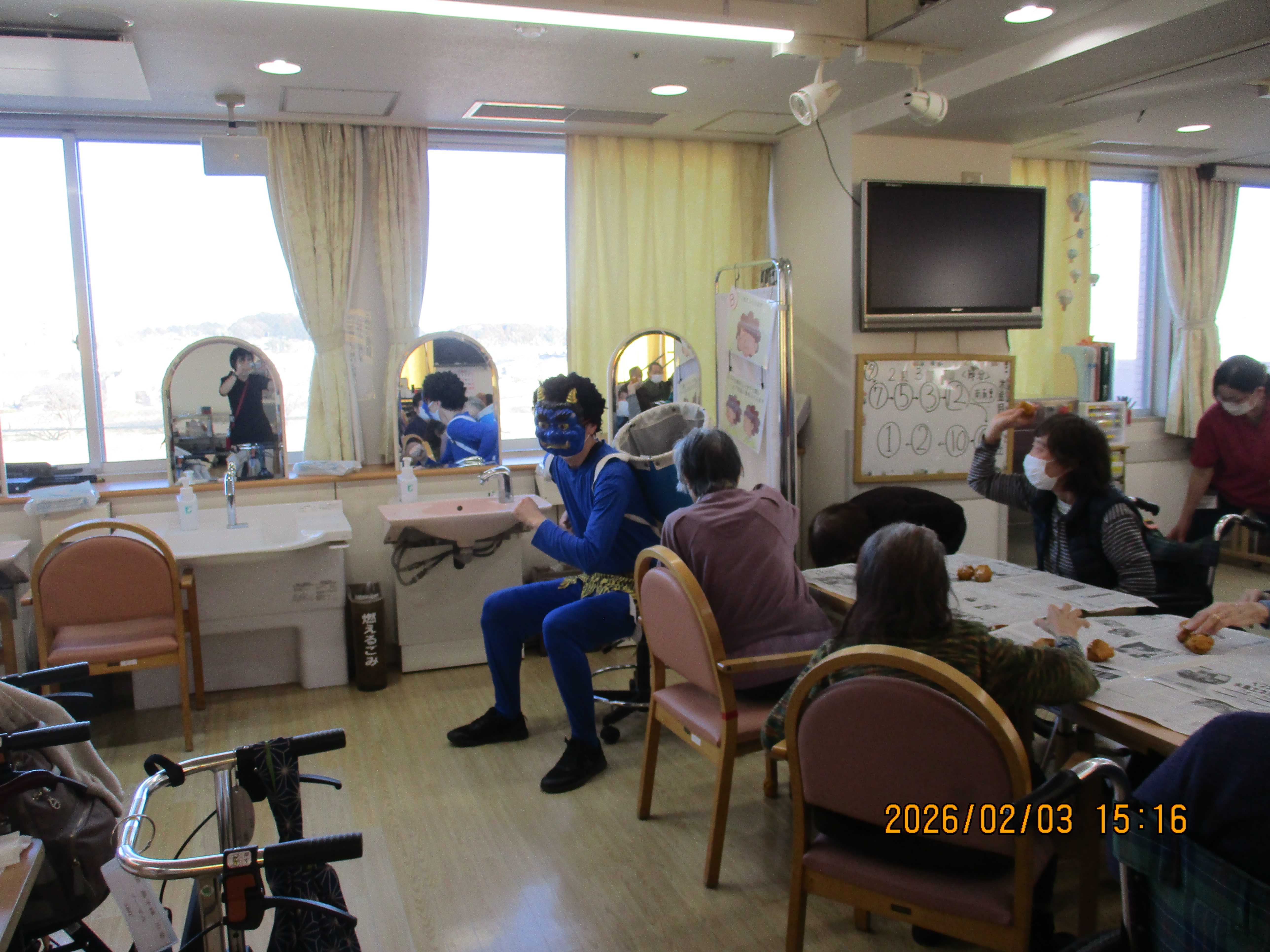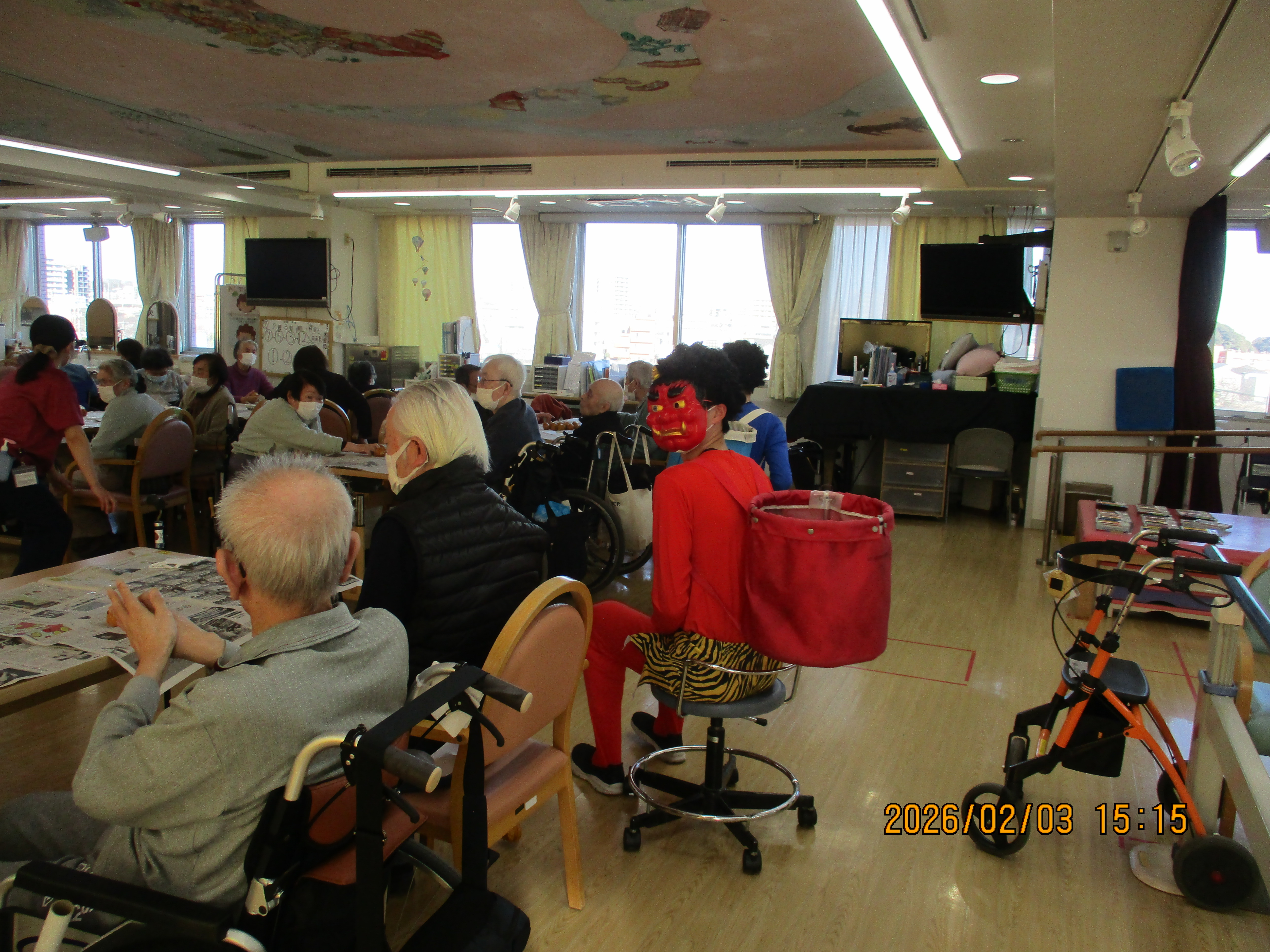 また、「♪鬼のパンツは良いパンツ~♫」の音楽に合わせて、赤鬼と青鬼が利用者様の席の間を動き回り、皆様笑顔で豆まきを楽しまれていました。