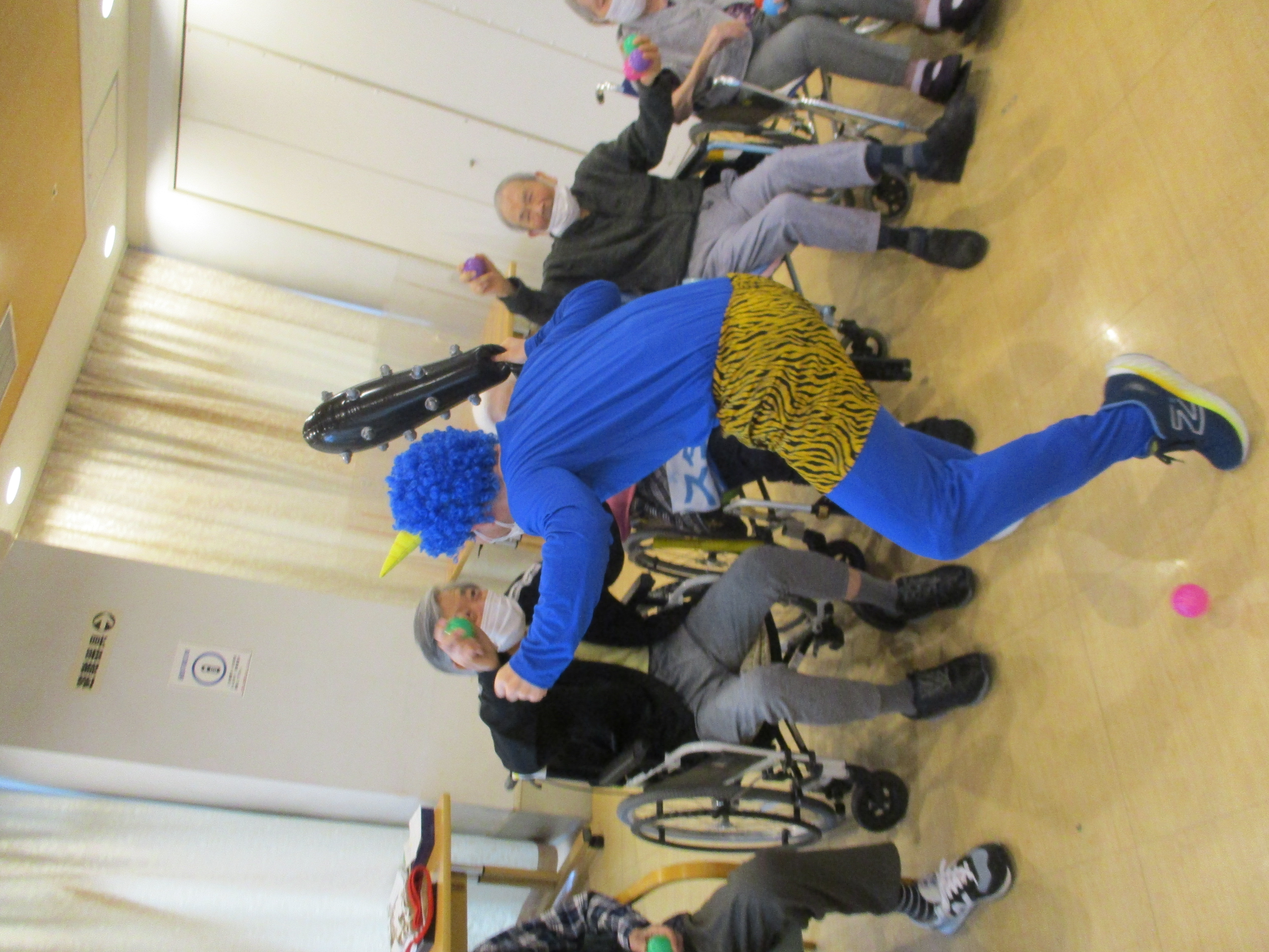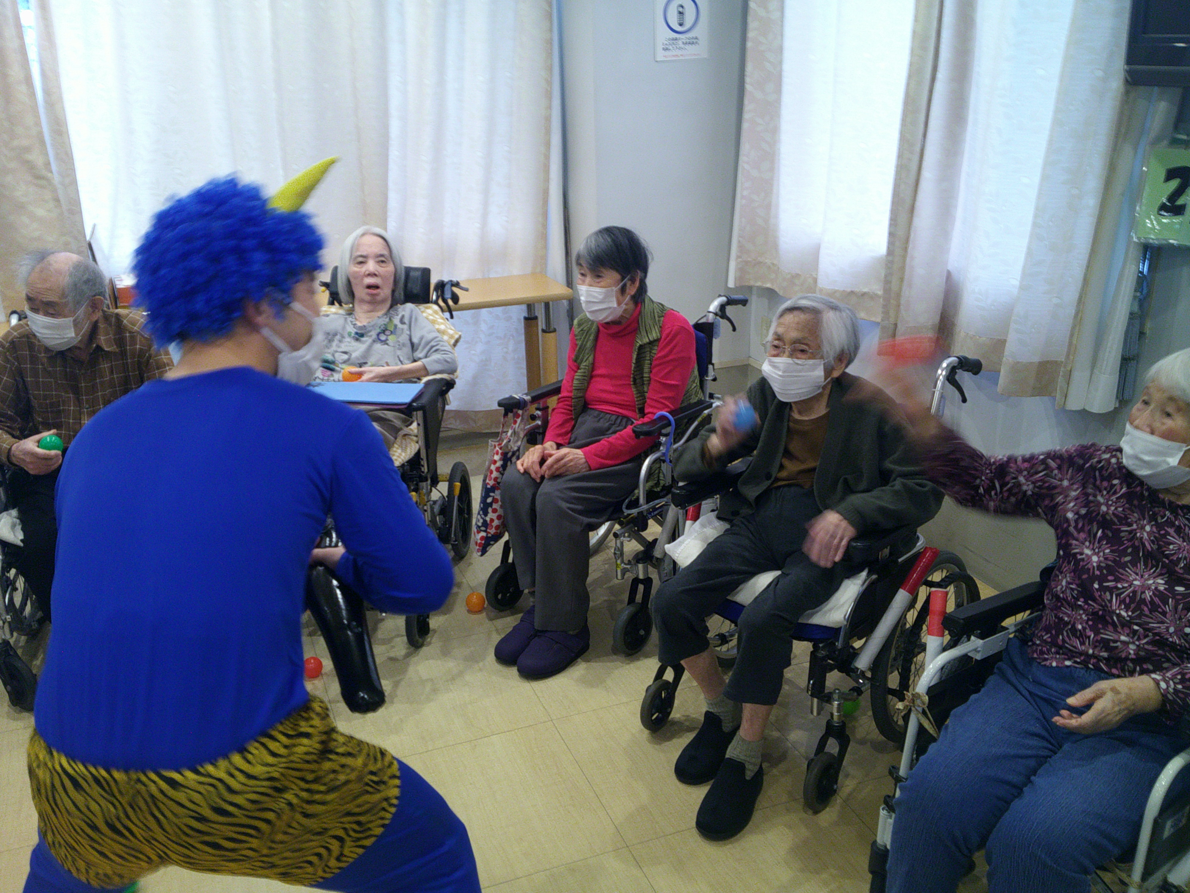 当日は、赤鬼や青鬼の屈強な鬼たちが登場。入所者様は「鬼は外~!」と声を上げながら、豆に見立てたカラーボールを鬼に向かって力いっぱい投げ、鬼退治が始まりました。