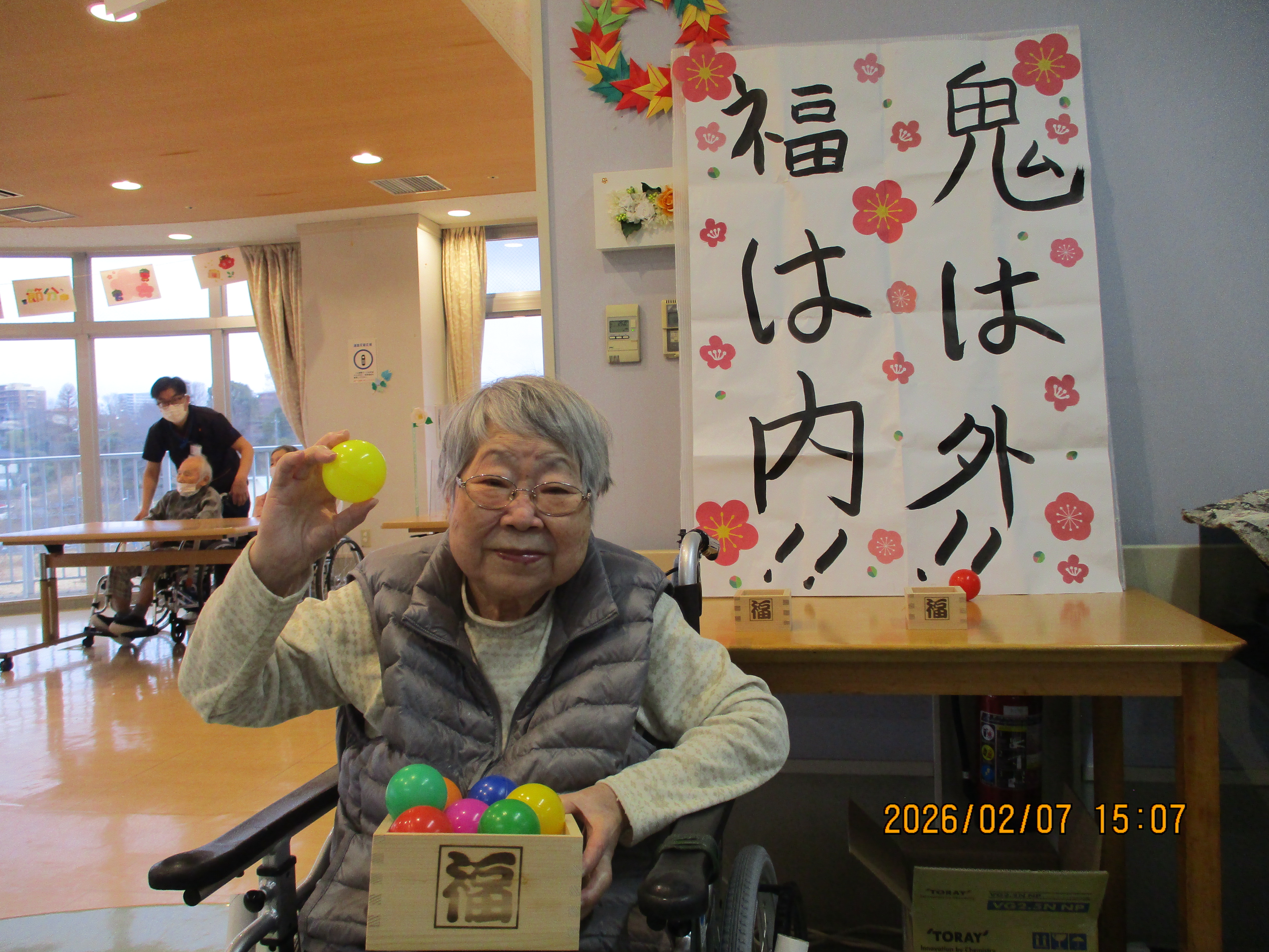 立春を過ぎ、暦の上では春とはいえ、まだまだ寒い日が続く2月7日、老健では各フロアごとに節分会を行いました。
