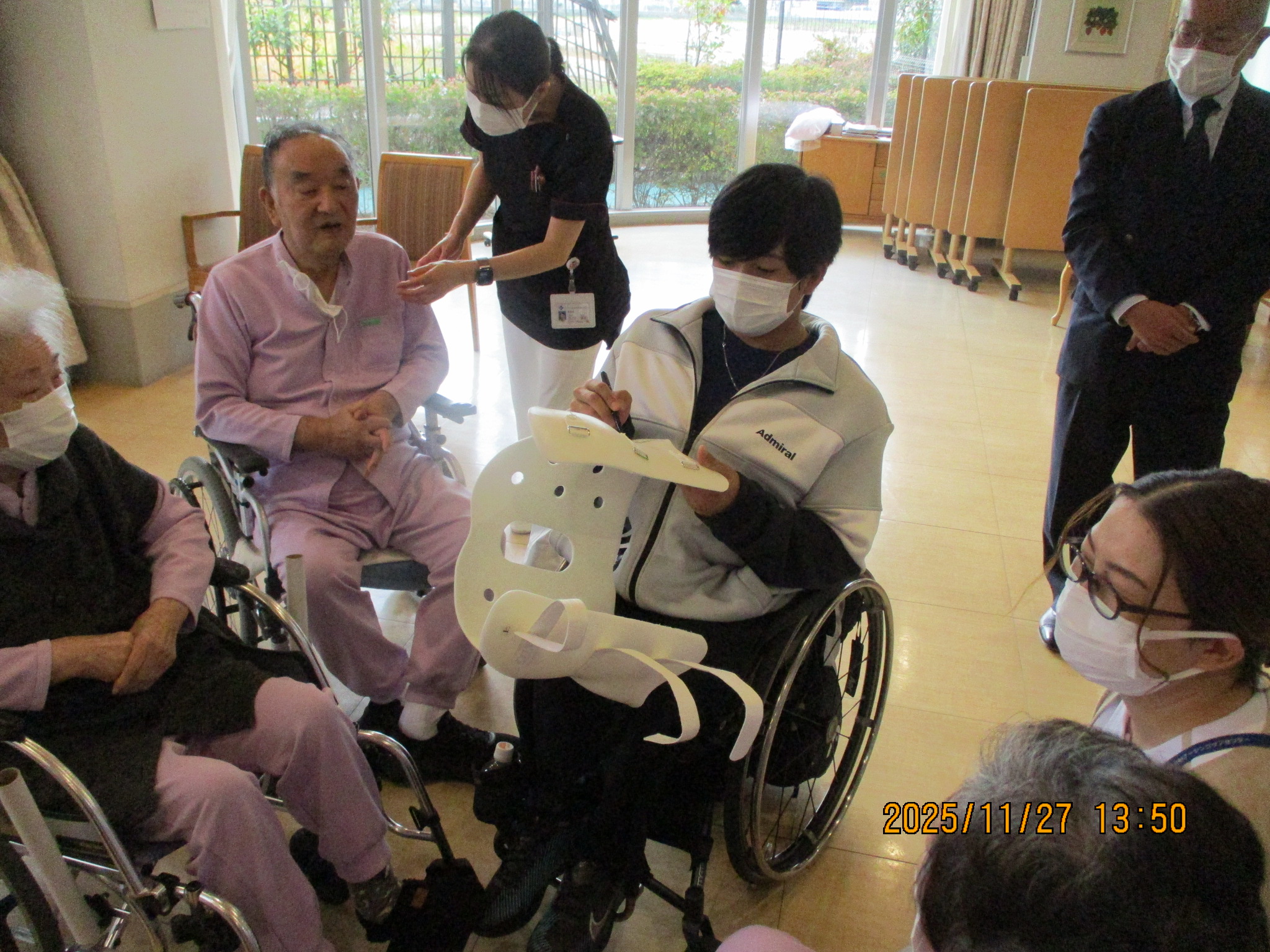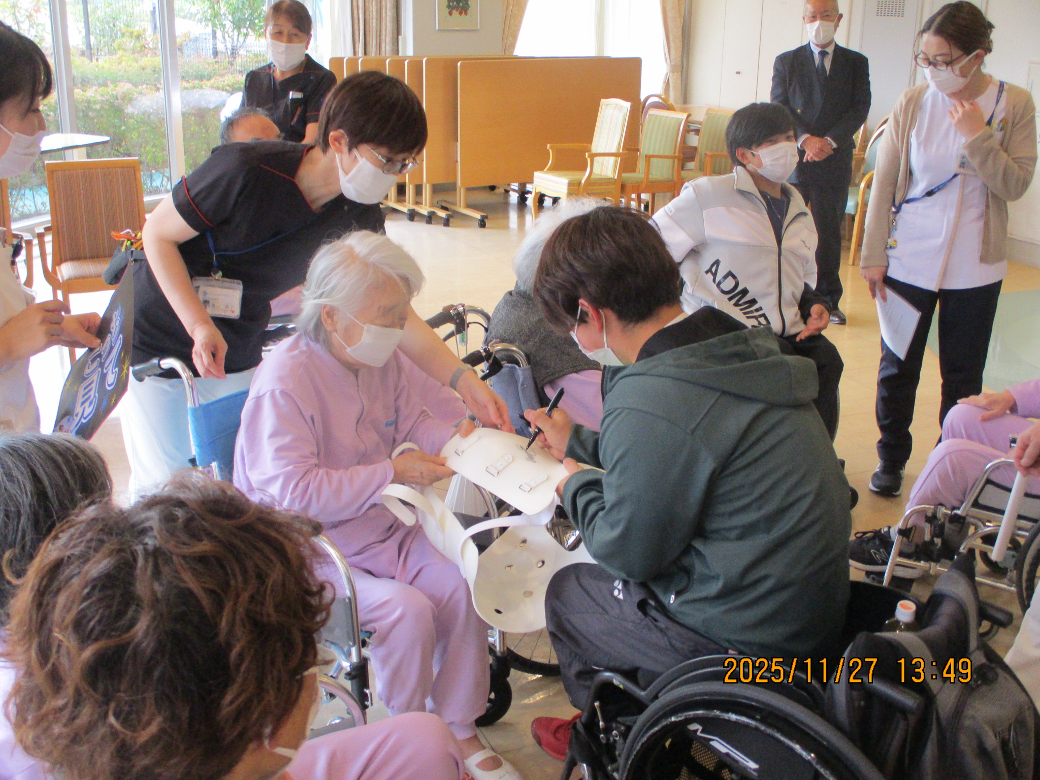 皆さんで記念写真を撮った後は、和やかな雰囲気で交流が始まり、ある患者者は自身のコルセットに3人のサインを