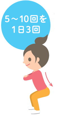 ② スクワット:深呼吸をするペースで5~10回を1セットとして、1日3回行います。足は肩幅に広げて立ちます。膝がつま先より前に出ないように注意し、お尻を後ろに引くよう体を沈めます。